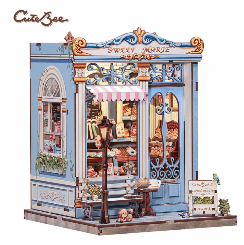 Szene inspiriert von einer bezaubernden französischen Konditorei. CuteBee-Bausatz zum Zusammenbauen mit 242 Teilen. Einfacher Zusammenbau, der zwischen 2-4 Stunden dauern kann. Ungefährer Maßstab 1:20, 1:24. Beinhaltet LED-Beleuchtung, die mit 2 AAA-Batterien funktioniert (nicht enthalten).