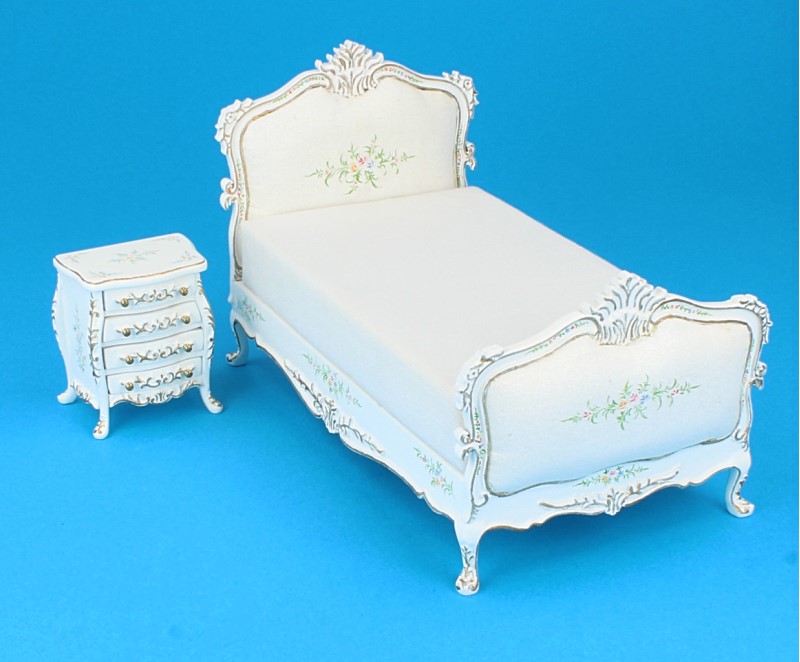 Einzelbett mit Kopf- und Fußteil, dekoriert mit floralen Details, begleitet von einem Nachttisch mit drei Schubladen und passendem Design. Beide Möbelstücke haben ein weißes Finish mit goldenen Akzenten und handgemalten floralen Motiven.