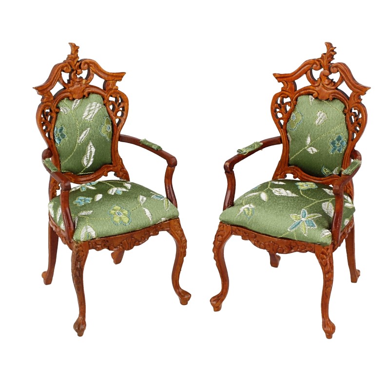 Set aus zwei Stühlen mit geschnitztem Holzgestell und grünem Bezug mit floralen Motiven. Nur ein Set von 2 Stühlen verfügbar.