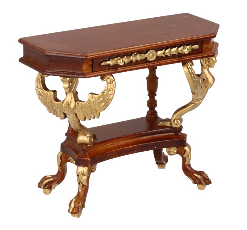 Wandtisch aus Holz mit goldenen Details in Form von geflügelten Figuren und Krallenbeinen. Er verfügt über eine kleine Schublade, die mit goldenen Blumenmotiven verziert ist.